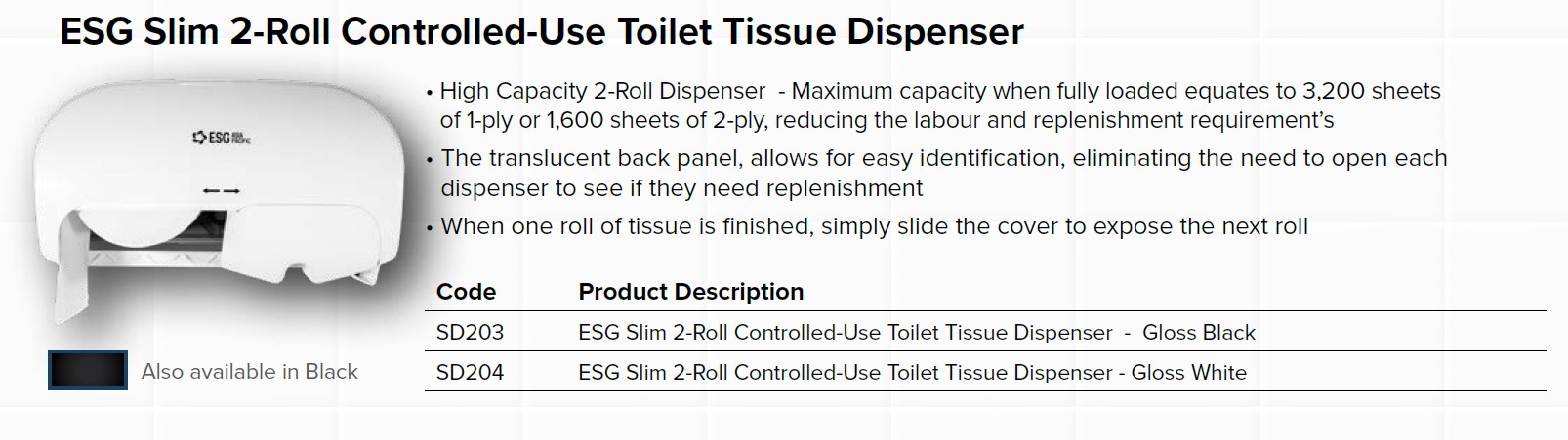 DISPENSER, TOILET PAPER ESG SLIM 2-ROLL CONTROLLED-USE - WHITE Takes ESG 236 Slim toilet tissue.